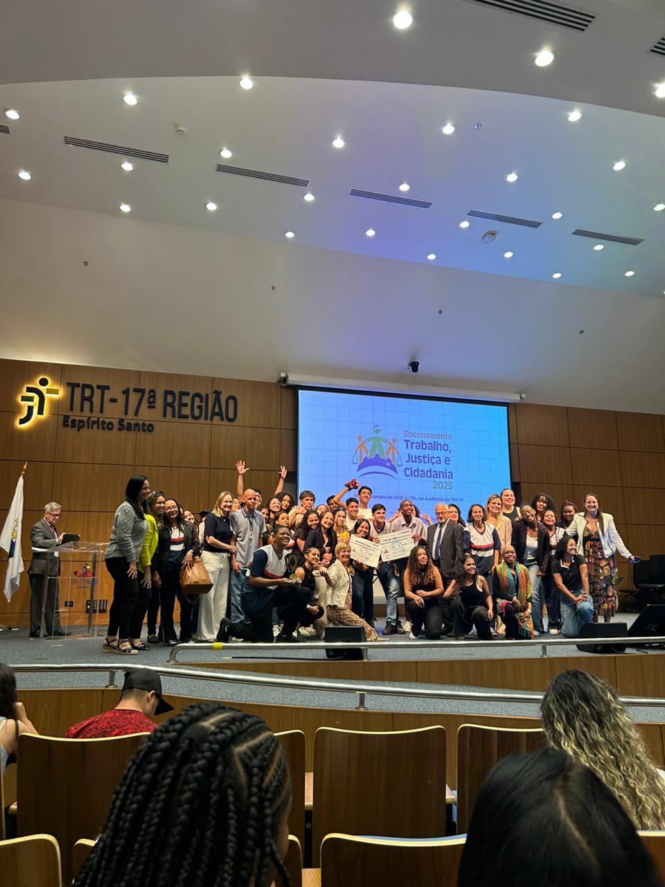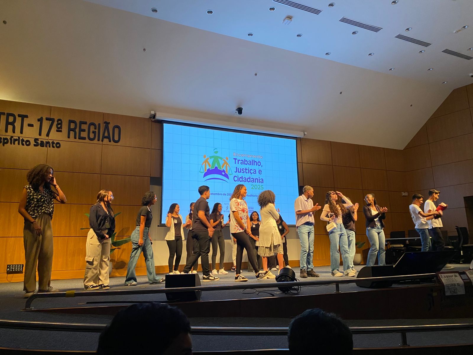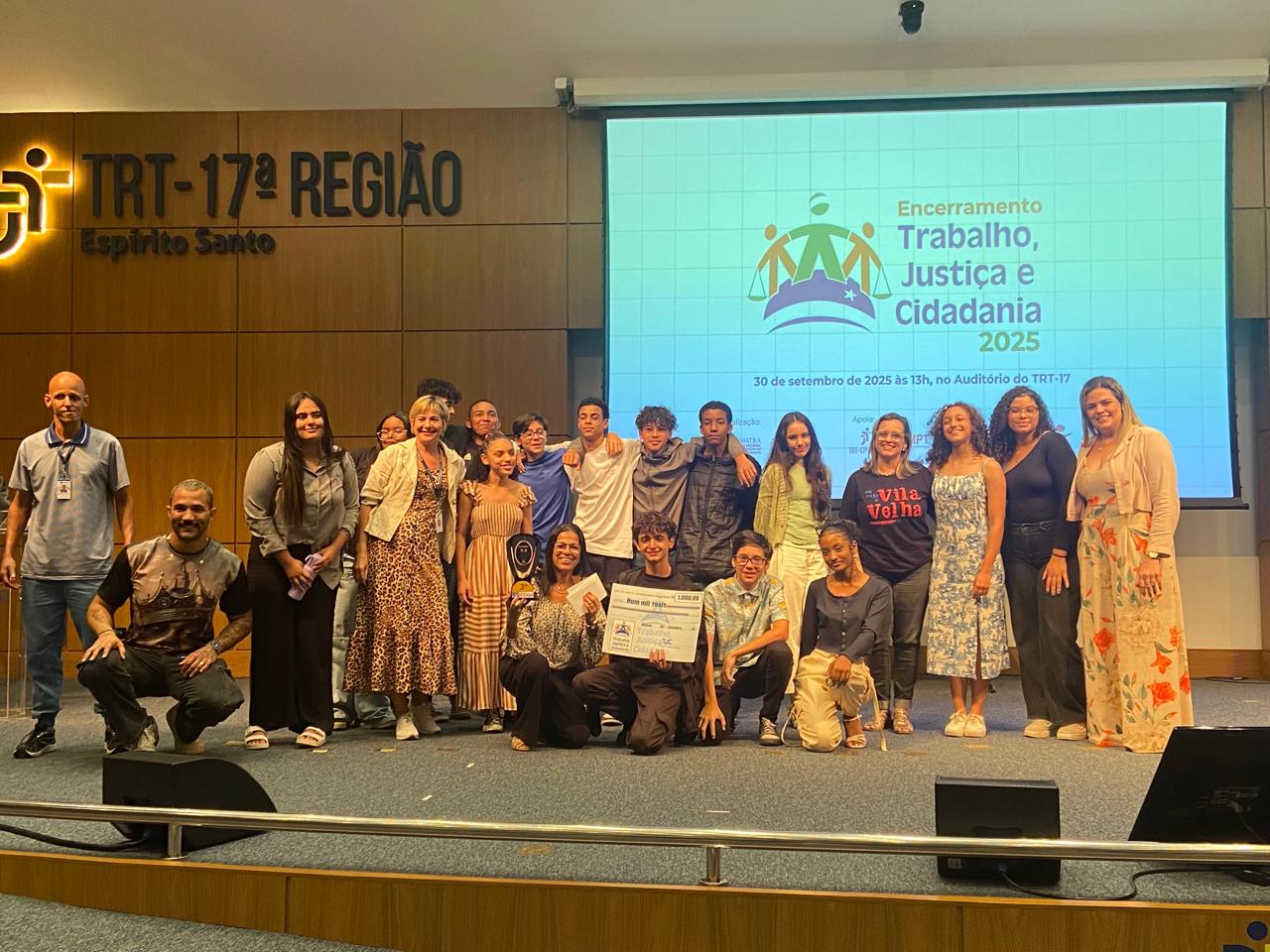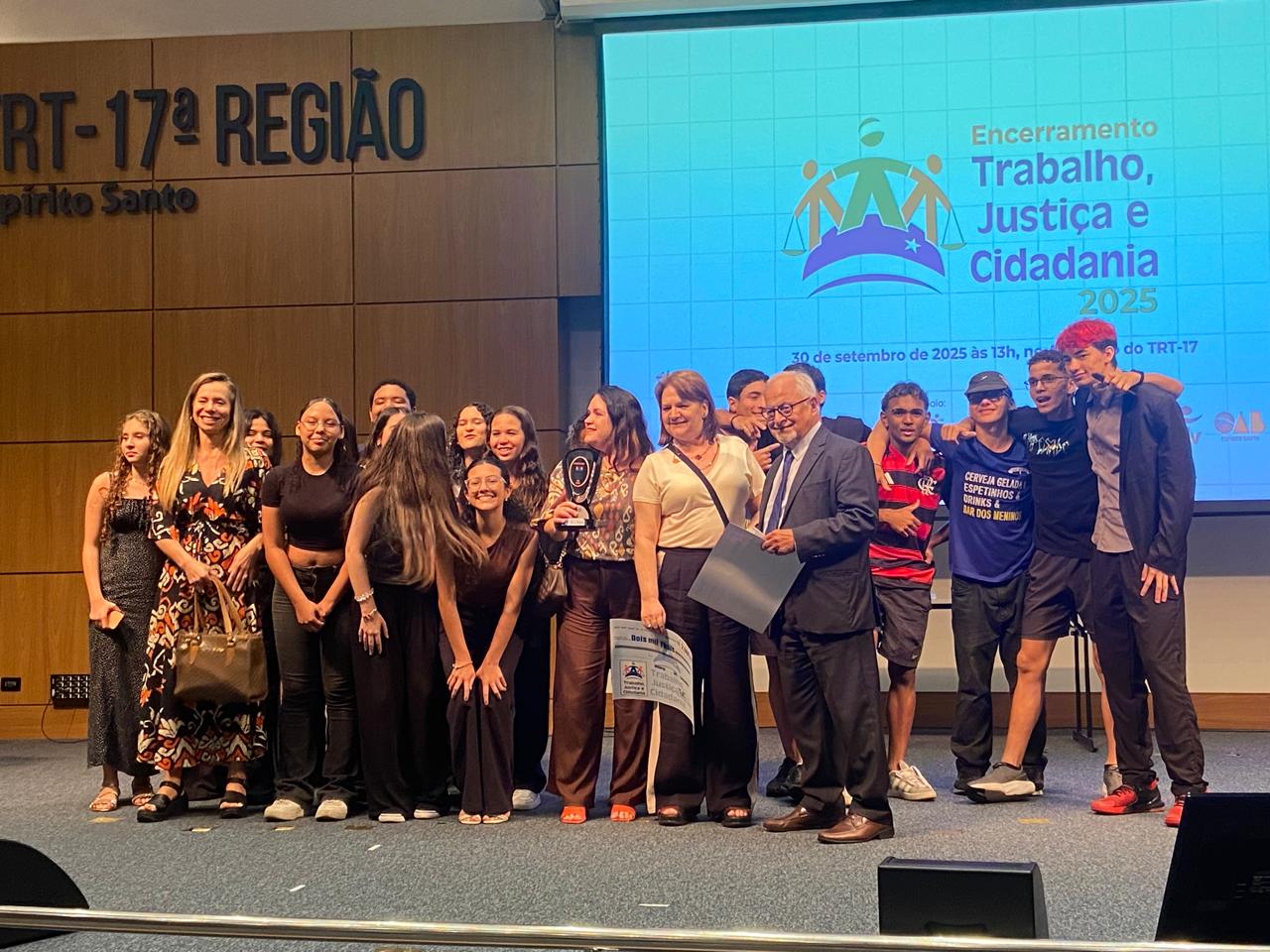 O Auditório do Tribunal Regional do Trabalho da 17ª Região ficou lotado, no dia 30 de setembro, para a cerimônia de encerramento do Programa Trabalho, Justiça e Cidadania (TJC) 2025, realizada pela AMATRA 17 em parceria com o TRT-17. O evento foi marcado pela alegria, pela criatividade e pela emoção dos estudantes, que levaram ao palco espetáculos de teatro, música, dança, áudios e vídeos sobre temas fundamentais como racismo, bullying, igualdade de gênero, dignidade da pessoa humana e a trajetória dos direitos trabalhistas no Brasil.