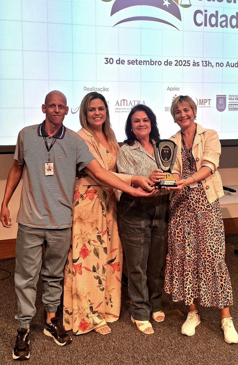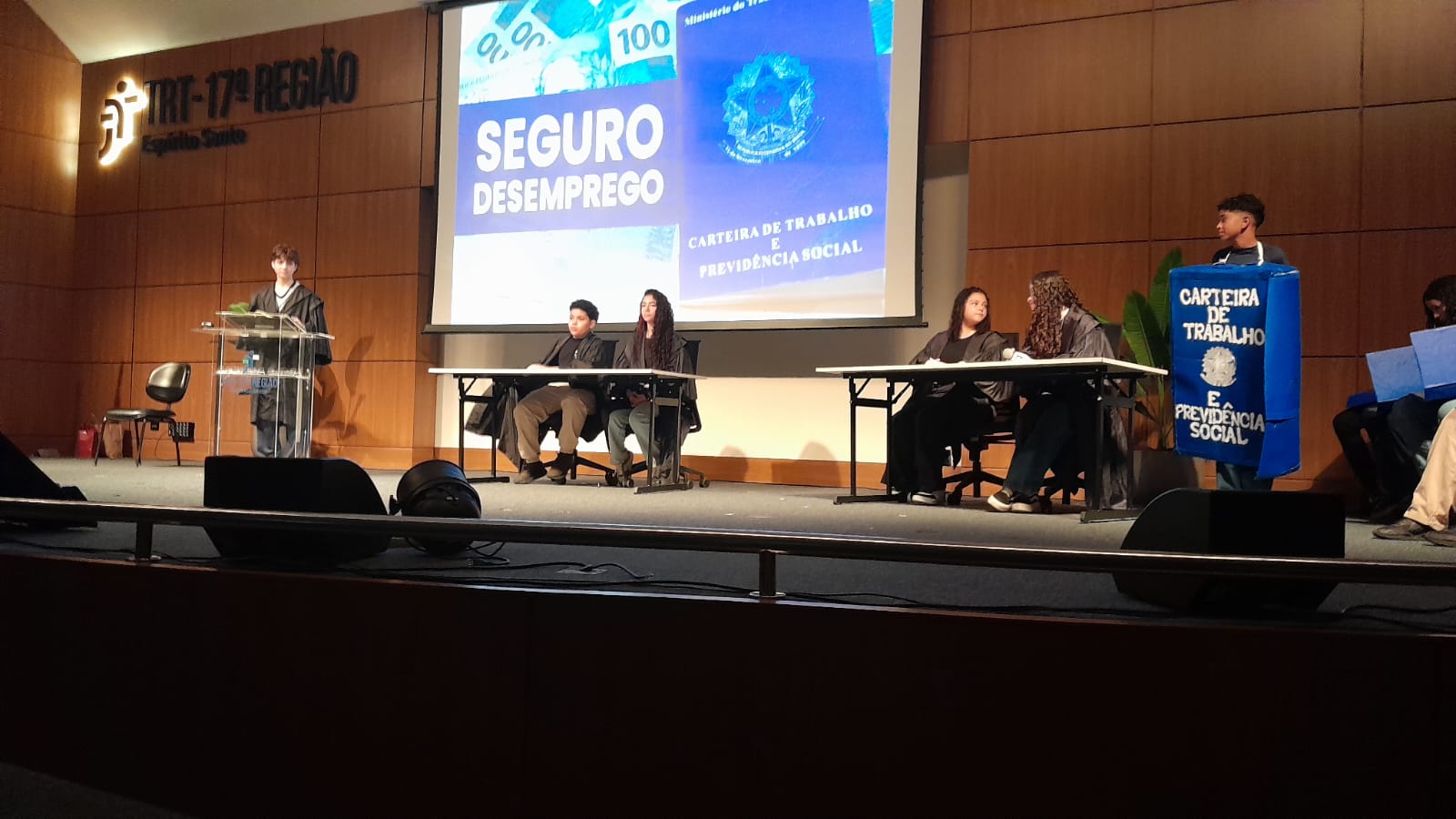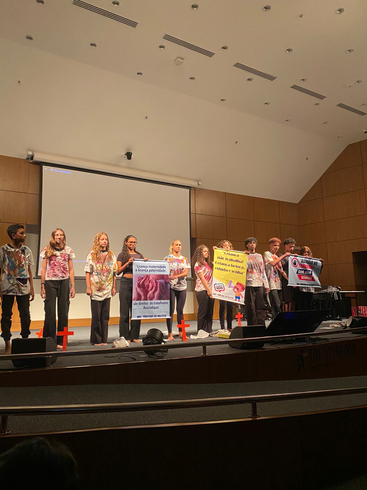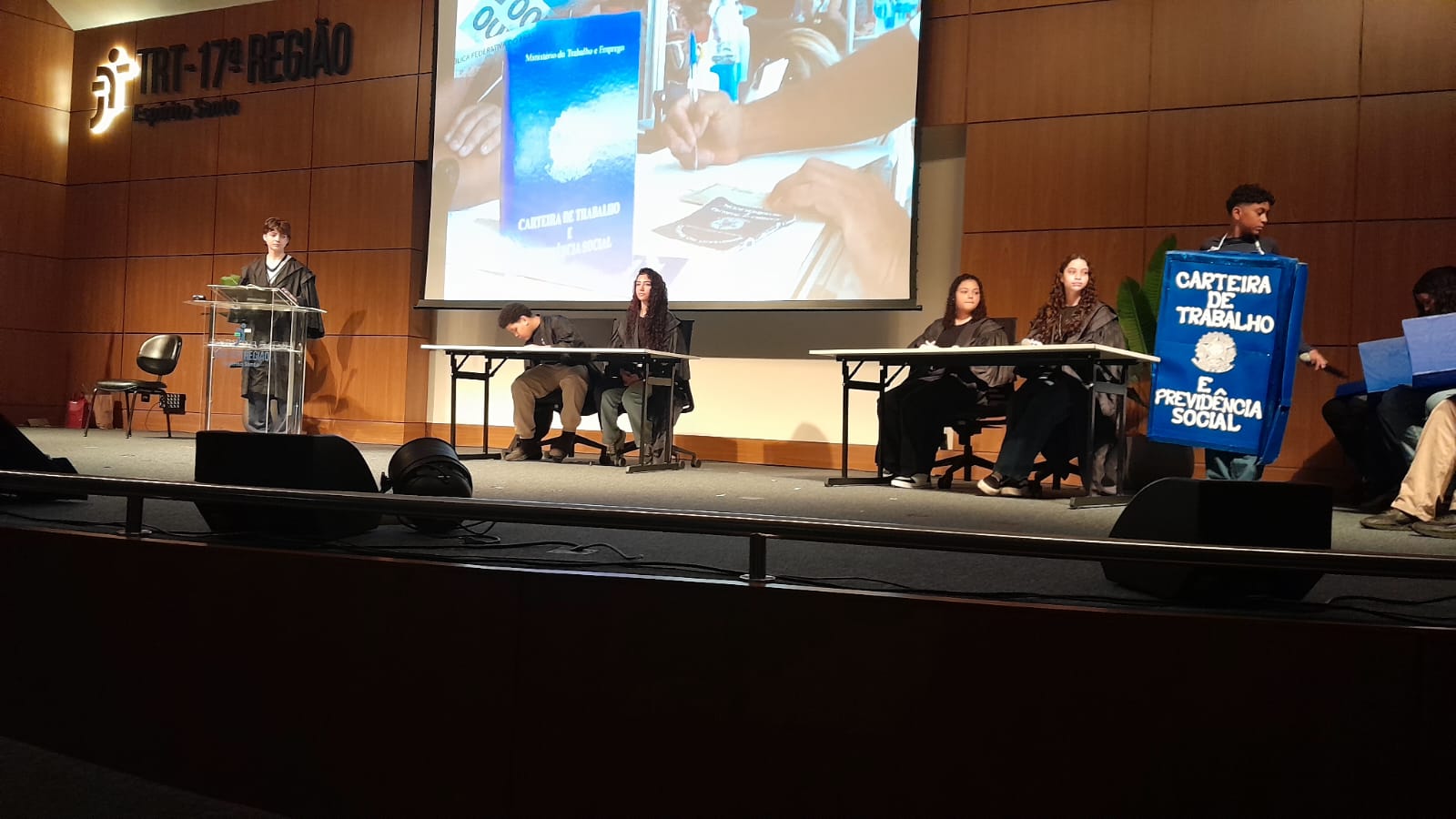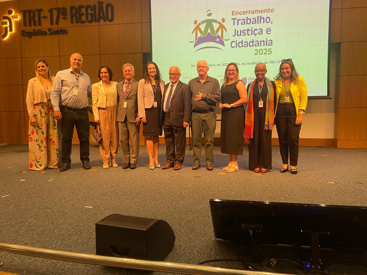 O Auditório do Tribunal Regional do Trabalho da 17ª Região ficou lotado, no dia 30 de setembro, para a cerimônia de encerramento do Programa Trabalho, Justiça e Cidadania (TJC) 2025, realizada pela AMATRA 17 em parceria com o TRT-17. O evento foi marcado pela alegria, pela criatividade e pela emoção dos estudantes, que levaram ao palco espetáculos de teatro, música, dança, áudios e vídeos sobre temas fundamentais como racismo, bullying, igualdade de gênero, dignidade da pessoa humana e a trajetória dos direitos trabalhistas no Brasil.