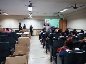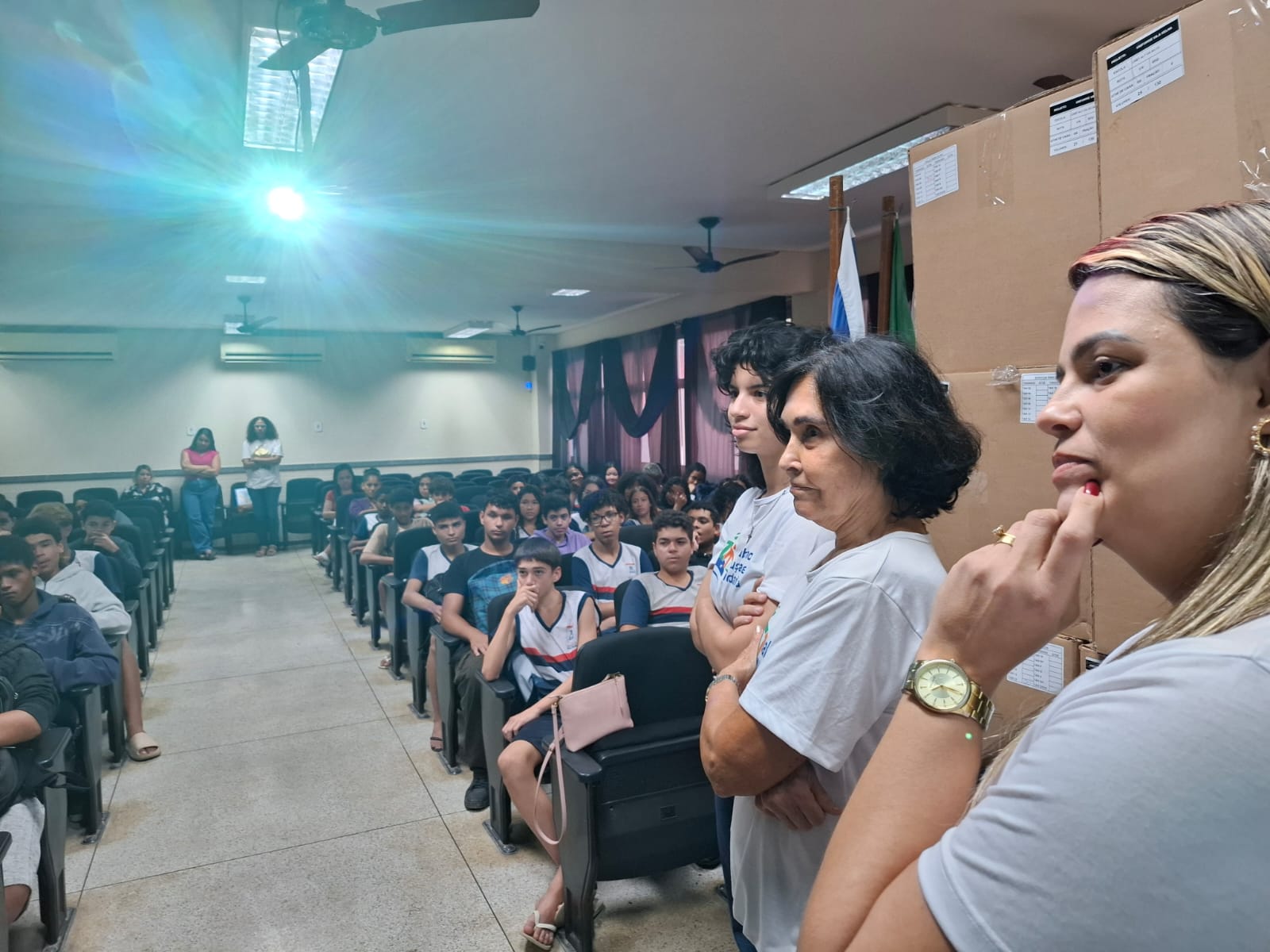 Na parte da tarde, a equipe seguiu para a UMEF Professor Thelmo Torres, no bairro Itapoã, onde a atividade aconteceu em uma quadra interna coberta. No momento da chegada, foi montada uma tela para a exibição de imagens do programa. A diretora da escola, Geyza, deu as boas-vindas à equipe, mas precisou se ausentar para um procedimento médico, deixando a pedagoga Neide e demais auxiliares responsáveis pelo acompanhamento da atividade. A apresentação foi conduzida pela Desembargadora Maria Francisca, seguida das falas de Juliana, que exibiu vídeos e slides, da Professora Gilsilene e novamente da Desembargadora. Ao final, foram distribuídas cartilhas educativas aos estudantes. Como a quantidade inicialmente levada foi insuficiente, o servidor Josué prontamente buscou exemplares remanescentes no carro, deixando mais 20 unidades na escola.