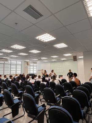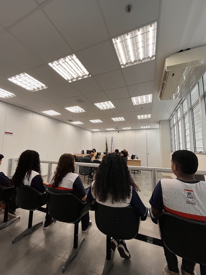 Os alunos conheceram a dinâmica de uma audiência e visitaram a 14ª Vara do Trabalho, sendo recebidos pela diretora Marcielle e pelos demais servidores, ouvindo explicações sobre a estrutura e o funcionamento da vara.
